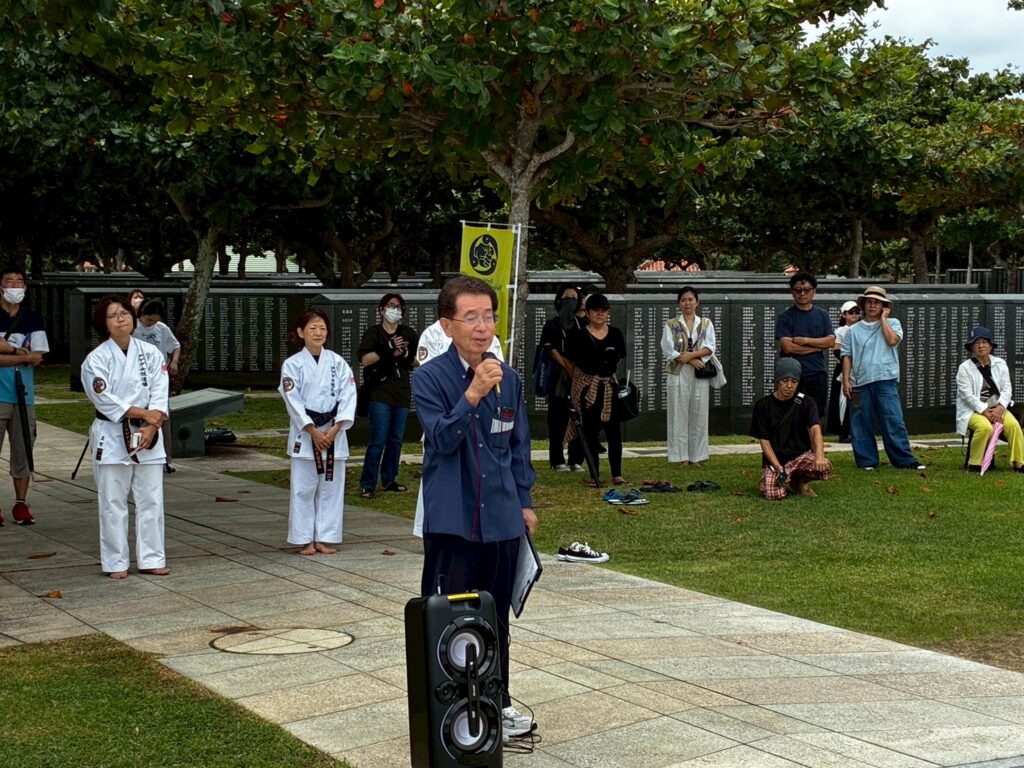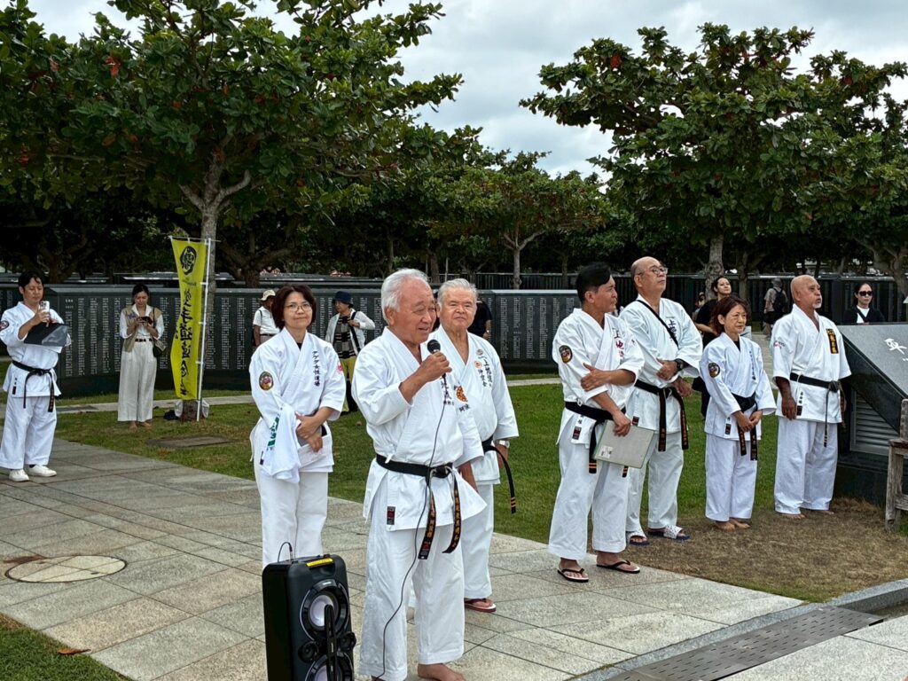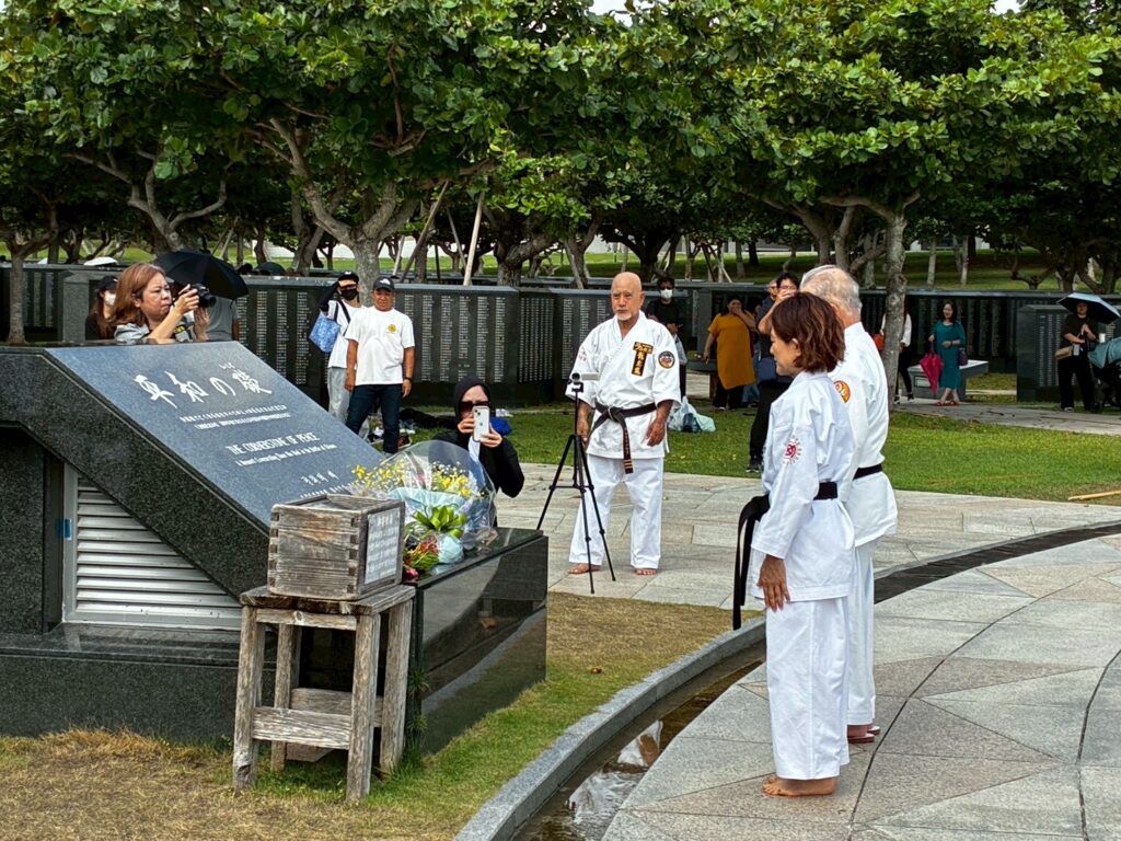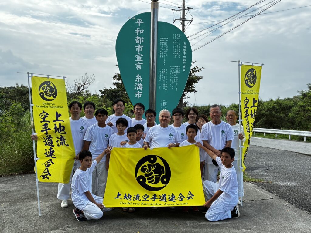 私たち上地流空手連合会は「平和の武」としての空手の精神を重んじ、恒久平和を祈念する機会として慰霊奉納演武の実施前に、糸満市平和都市宣言モニュメントから平和の礎までの平和行進を実施いたしました。